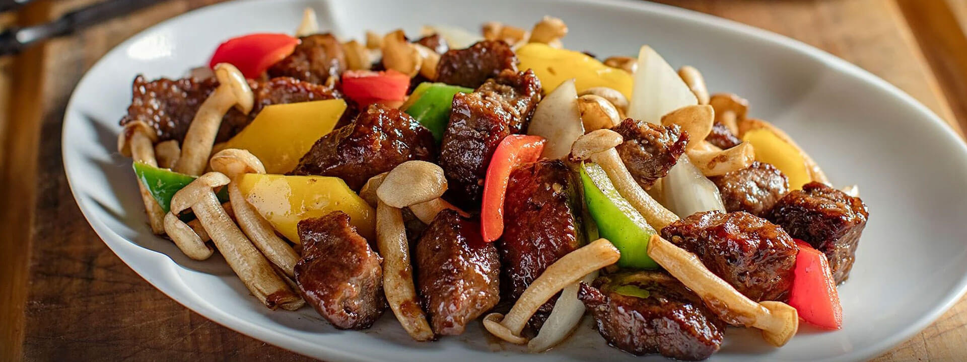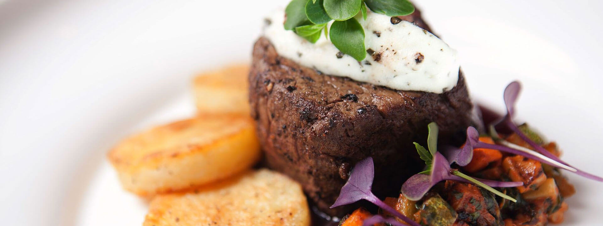 캐러멜 크러스트를 곁들인 부드러운 스테이크가 제공됩니다.