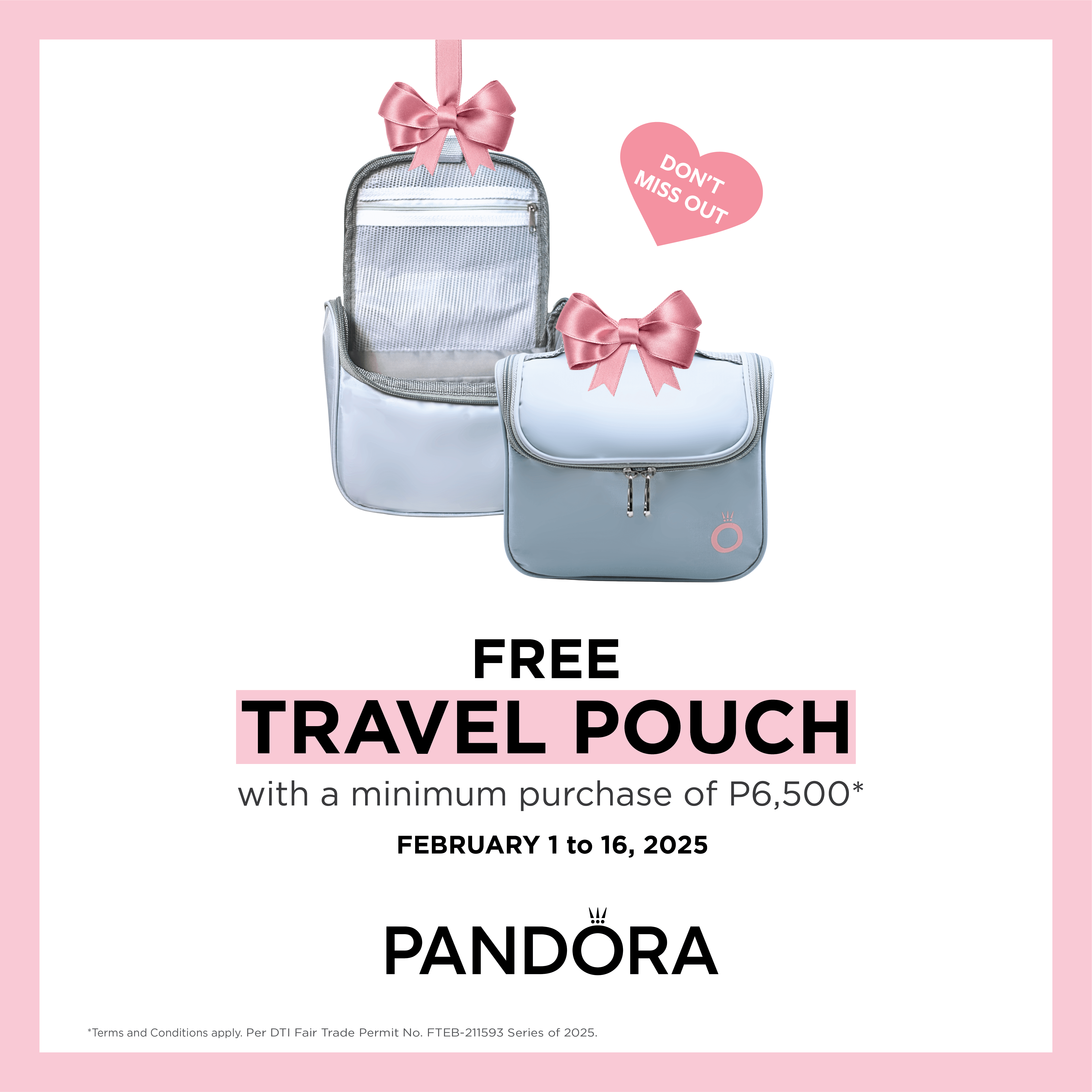 판도라에서 최소 PHP6,500 이상 구매 시 여행용 파우치를 증정합니다. 판도라 GF, 뉴포트 몰