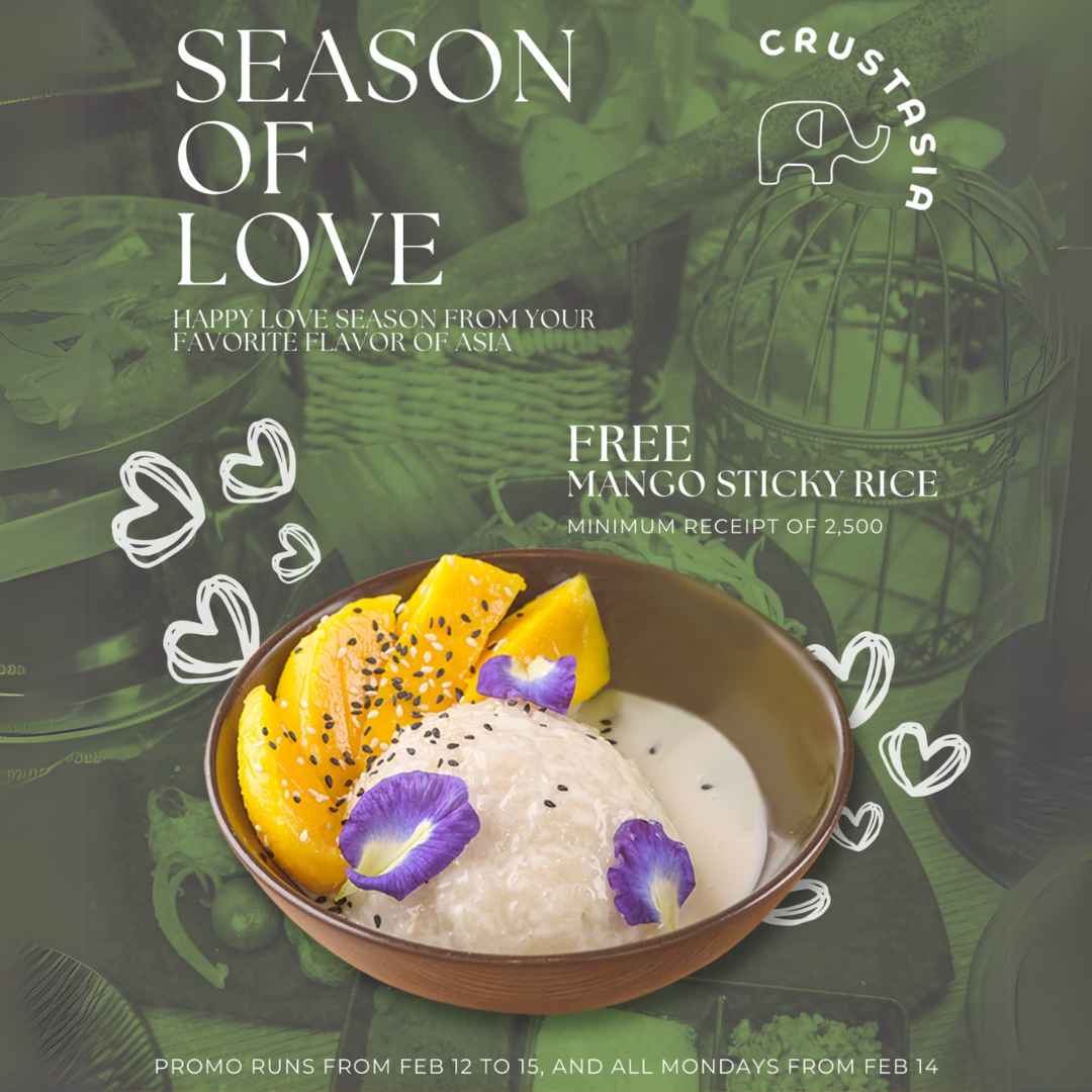 달콤한 혜택이 있습니다! 크러스타시아에서 최소 PHP2,500 이상 식사 시 타이 망고 스티키 라이스 디저트를 무료로 드세요. 2월 15일까지, 그리고 발렌타인데이 이후 매주 월요일에 이용 가능합니다. #크러스타시아