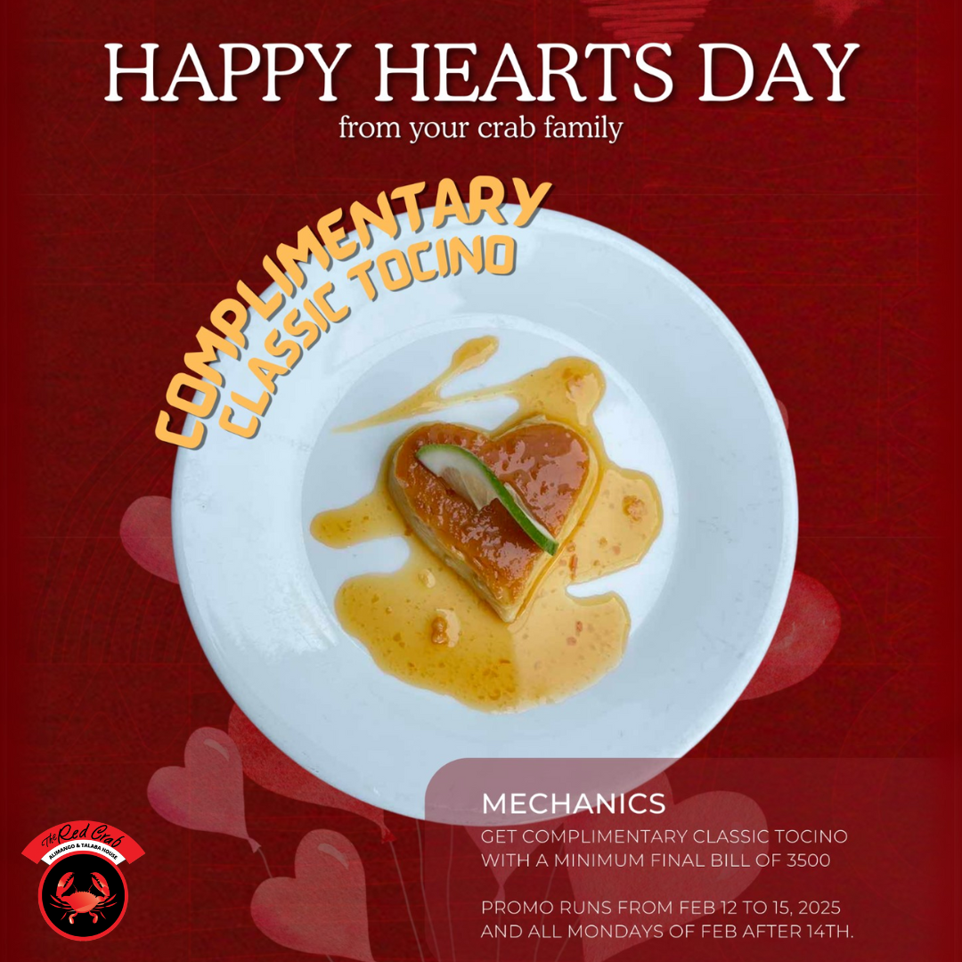 더 레드 크랩에서 최소 PHP3,500 이상 식사 시 무료 클래식 토치노 식사와 함께 따뜻한 필리핀의 풍미를 맛보세요. 혜택은 2월 16일까지 유효하며 발렌타인데이 이후 매주 월요일에 제공됩니다. #더레드크랩