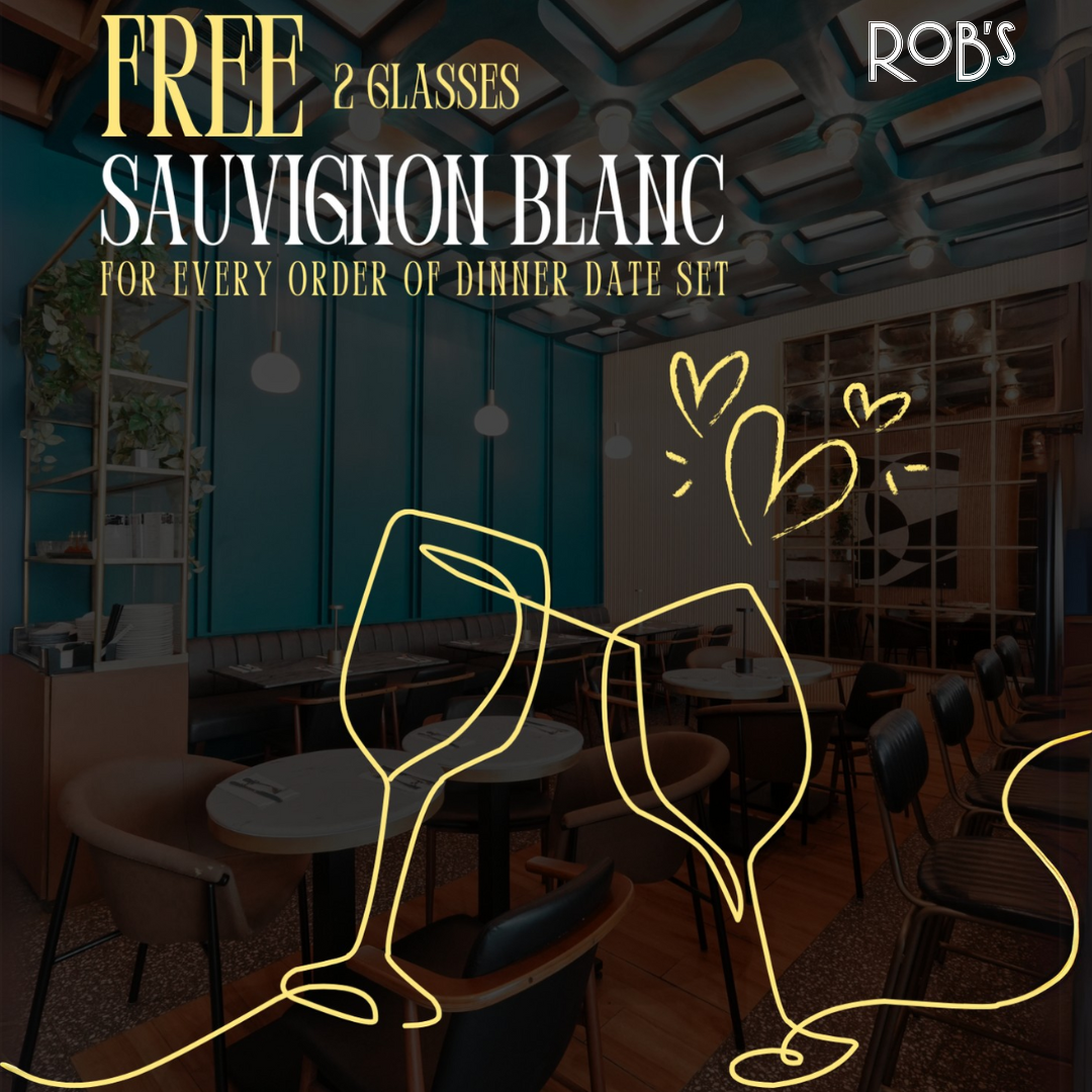 사랑과 달콤한 순간을 위해 건배하세요! 2월 16일까지 롭스 발렌타인 디너 데이트 세트 주문 시 소비뇽 블랑 2잔이 무료로 제공되며, 2월 매주 월요일에도 제공됩니다. #Robs
